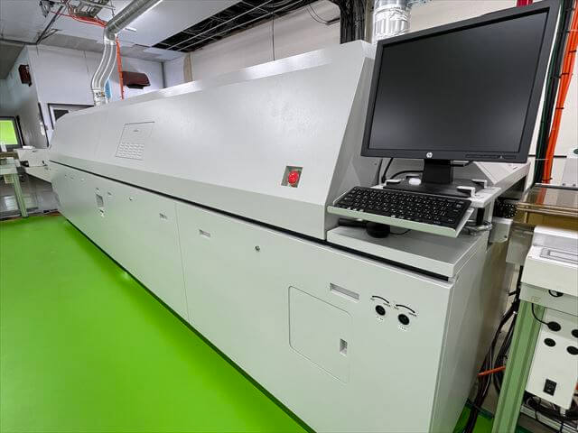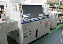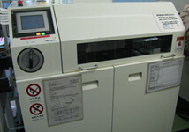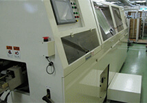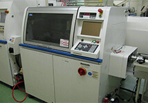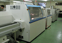 Lサイズ基板の自動はんだ付が可能です。電磁誘導式はんだ槽はポンプ式に比べて噴流波の変動が少なく、良好なはんだ付が可能です。